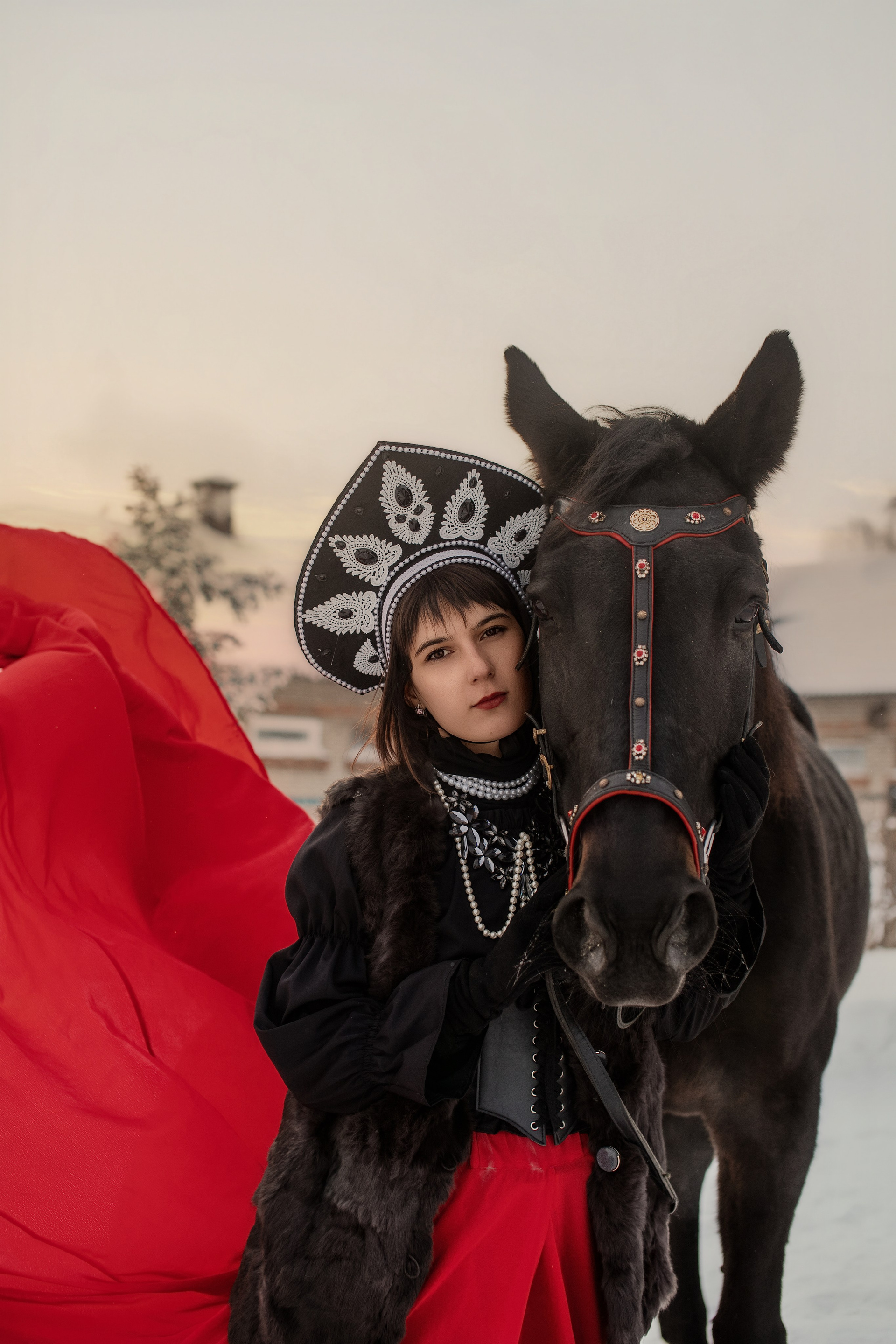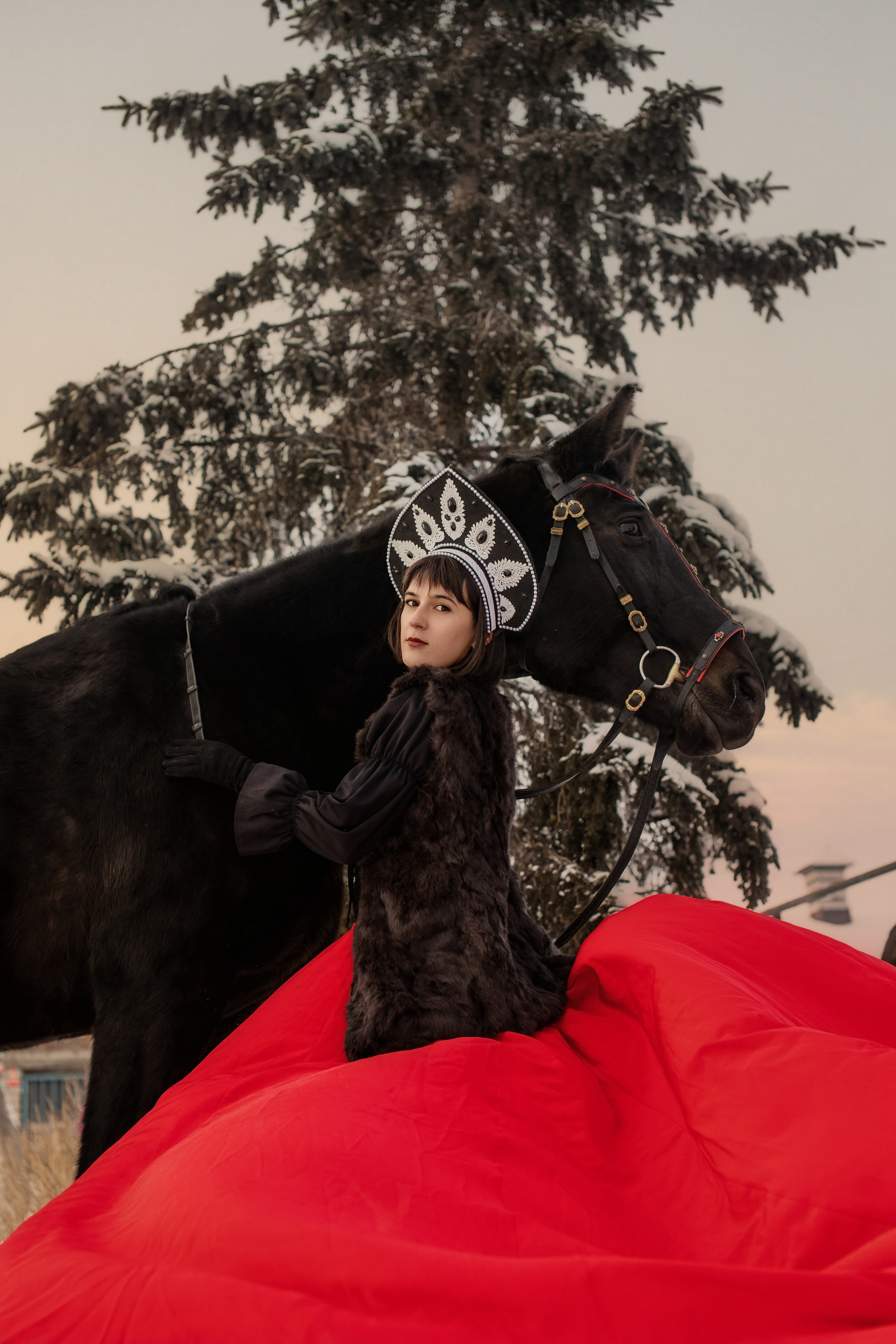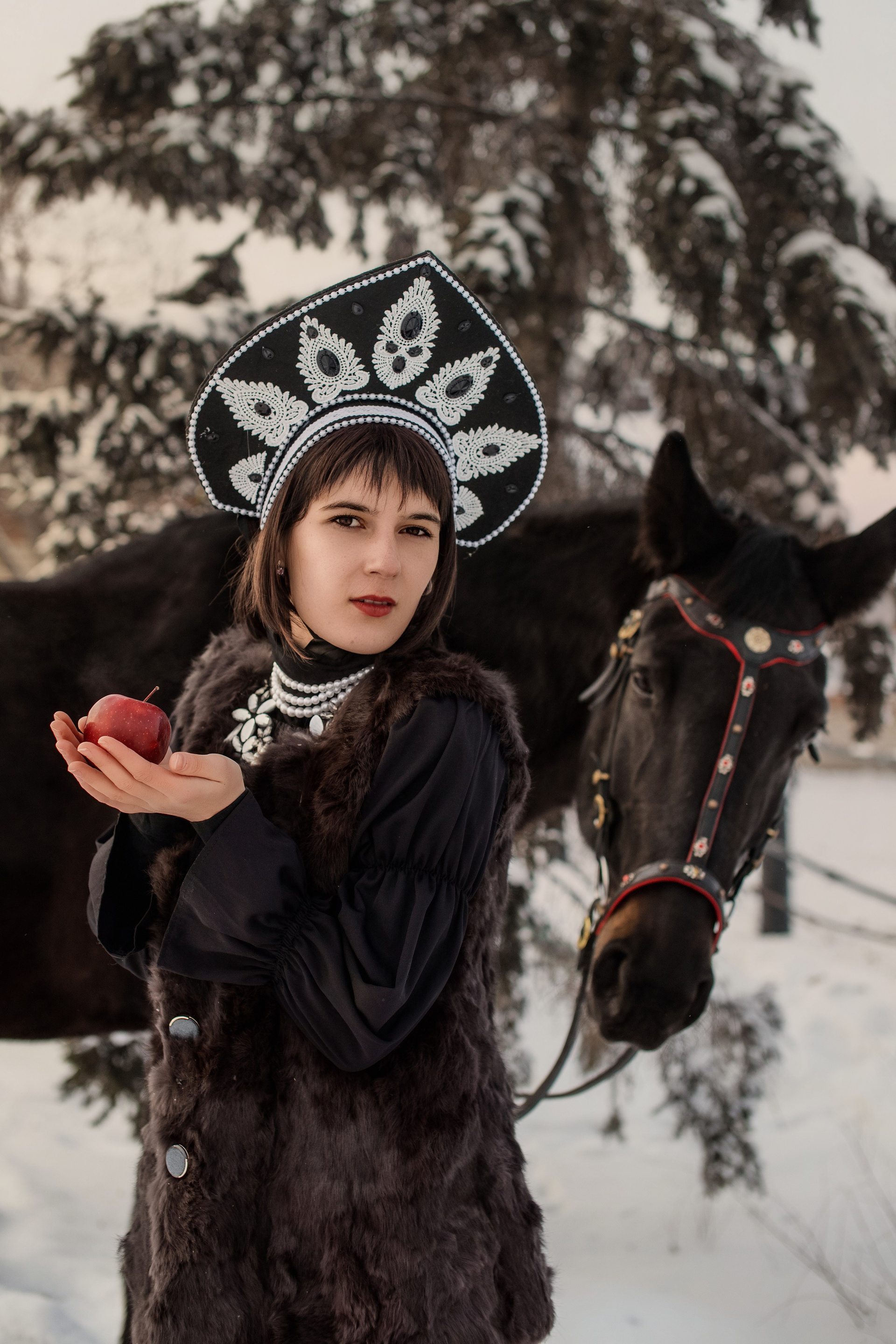 Доступен фото-проект «Мороз и Солнце» в колоритной тематике сибирской зимы. Современная интерпритация русского наряда с кокошником и красивейшая упряжь ручной работы украшающая лошадь. Проводим проект в любом городе, организация «под ключ».